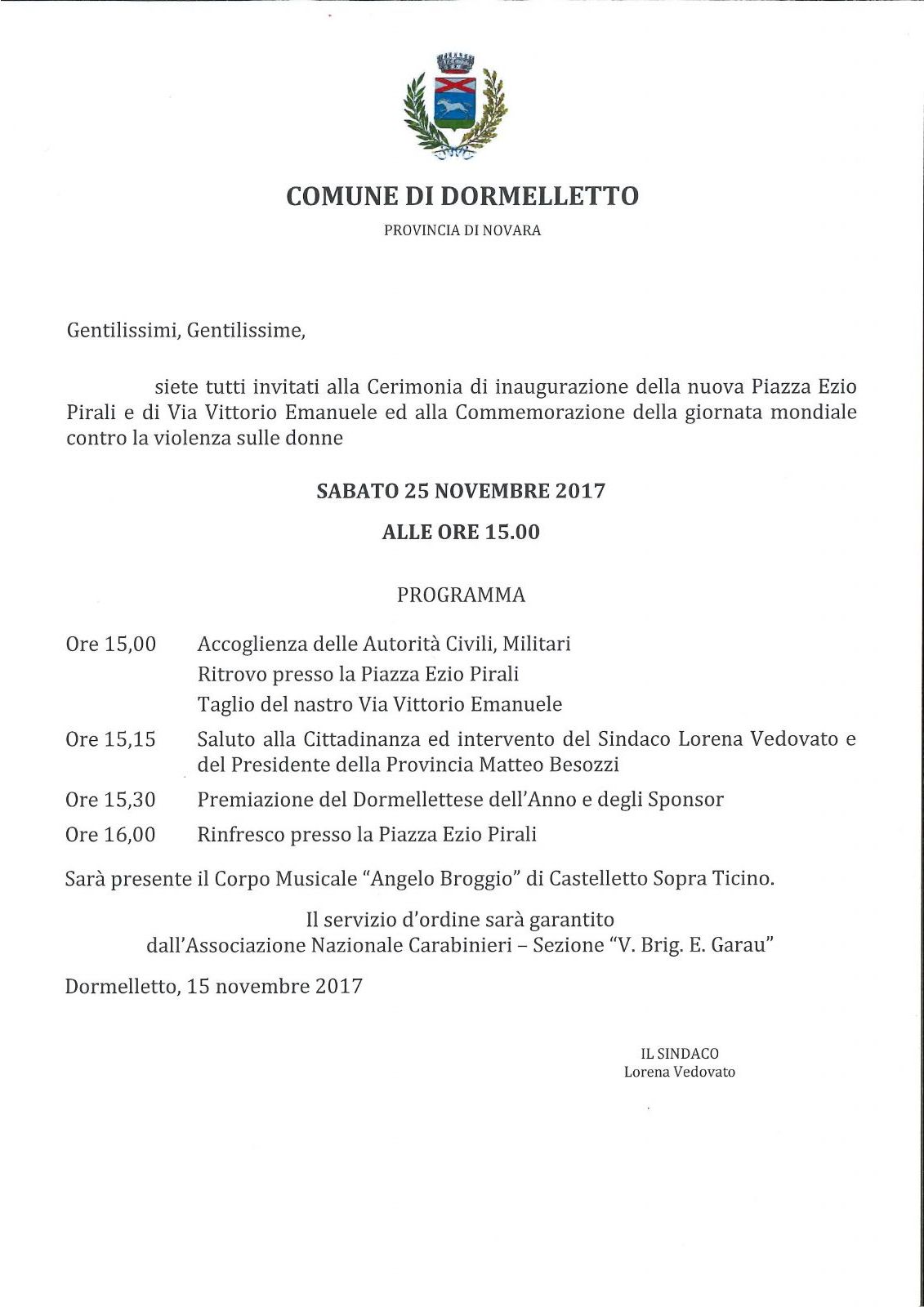 Sabato 25 novembre 2017, ore 15.00, siete tutti invitati alla Cerimonia di inaugurazione della nuova Piazza Ezio Pirali e di Via Vittorio Emanuele ed alla Commemorazione della Giornata Mondiale contro la Violenza sulle Donne.