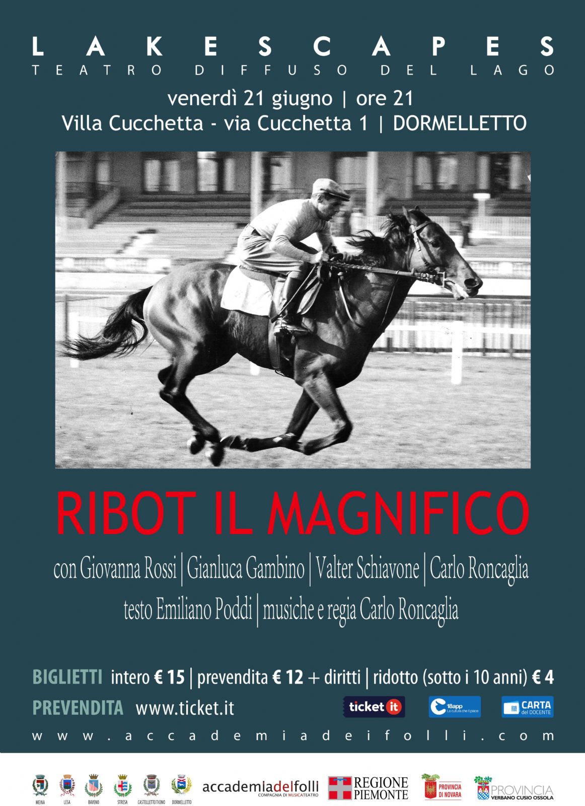 Venerdì 21 Giugno 2019, alle ore 21.00, presso la Villa Cucchetta sita in Via Cucchetta n. 1 a Dormelletto, si terrà la rappresentazione teatrale "RIBOT IL MAGNIFICO - Un'epopea iniziata a Dormelletto".