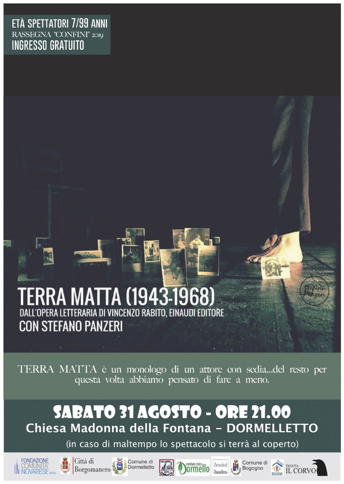 Sabato 31 agosto 2019, alle ore 21:00 presso la Chiesa della Madonna della Fontana in Via Monte Rosa a Dormelletto si terrà lo spettacolo teatrale "Terra Matta (1946-1968) dall'opera letteraria di Vincenzo Rabito, Einaudi Editore