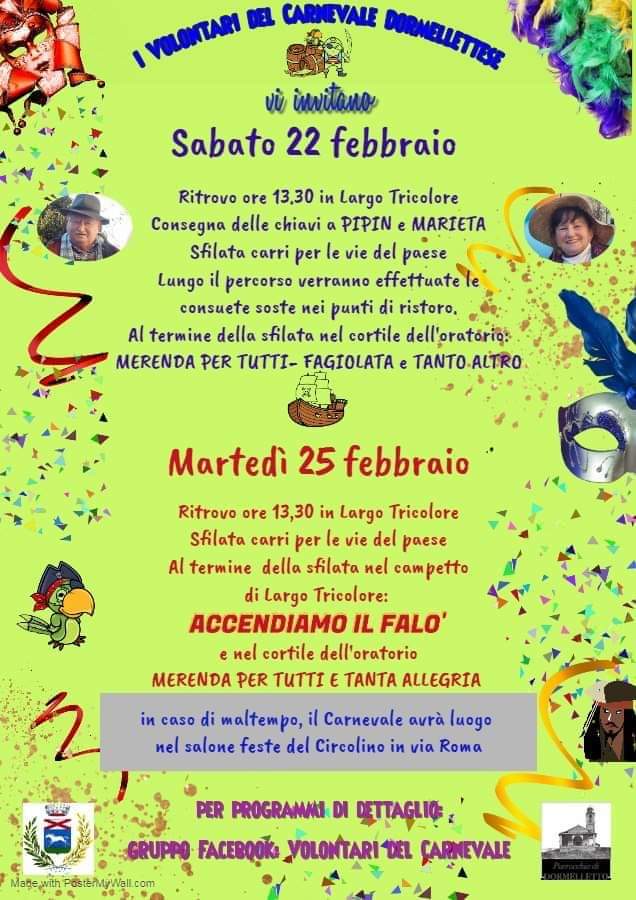 I Volontari del Carnevale Dormellettese Vi invitano sabato 22 febbraio e martedì 25 febbraio 2020 ai festeggiamenti del Carnevale per le vie del centro paese.