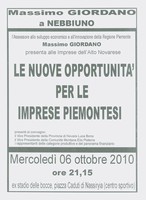 Mercoledì 6 ottobre alle ore 21,15 a Nebbiuno l'Assessore allo sviluppo economico e all'innovazione della Regione Piemonte Massimo GIORDANO presenterà alle Imprese dell'Alto Novarese le NUOVE OPPORTUNITA' PER LE IMPRESE PIEMONTESI